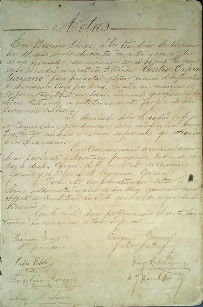 En Buenos Aires, a los tres días de Noviembre del año mil ochocientos noventa y cinco: los abajo firmados reuniéndose con el objeto de crear una sociedad recreativa titulada “Centro Orfeon Gayarre” para fomentar y tener unido el espíritu de asociación cuyo fin será, cuando sus recursos se lo permitan, tener un local adecuado que ofrecer a los socios destinado a entretenimiento propio de asociaciones cultas.