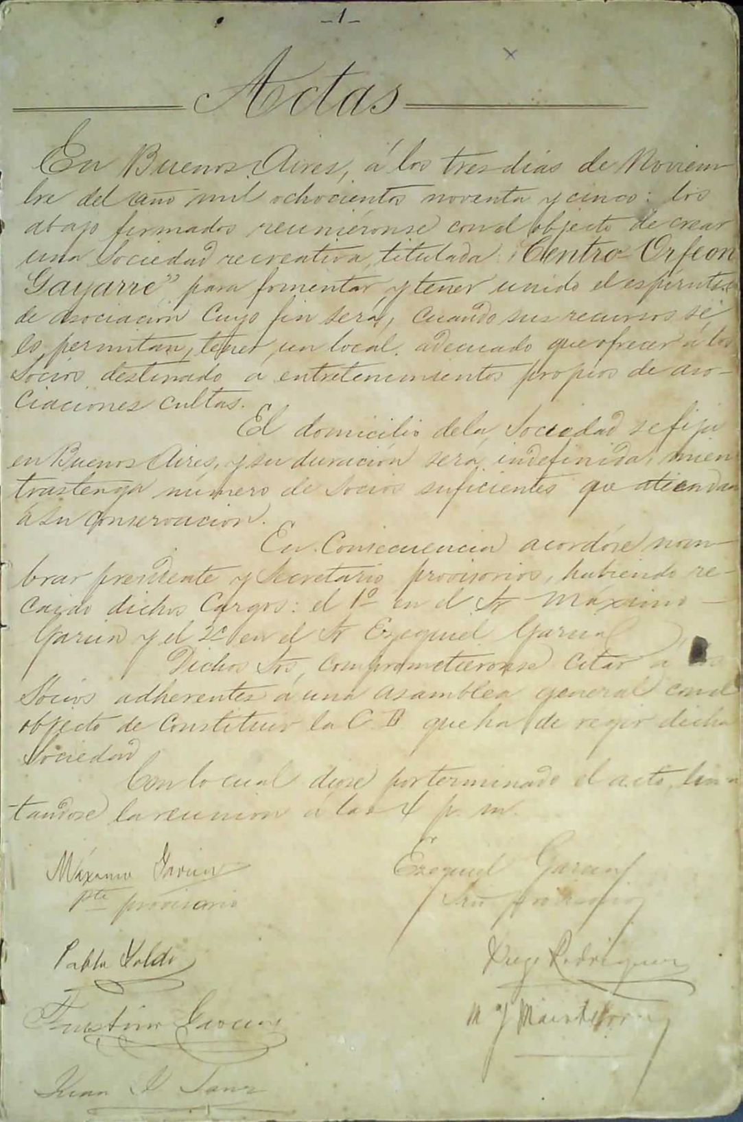 En Buenos Aires, a los tres días de Noviembre del año mil ochocientos noventa y cinco: los abajo firmados reuniéndose con el objeto de crear una sociedad recreativa titulada “Centro Orfeon Gayarre” para fomentar y tener unido el espíritu de asociación cuyo fin será, cuando sus recursos se lo permitan, tener un local adecuado que ofrecer a los socios destinado a entretenimiento propio de asociaciones cultas.
